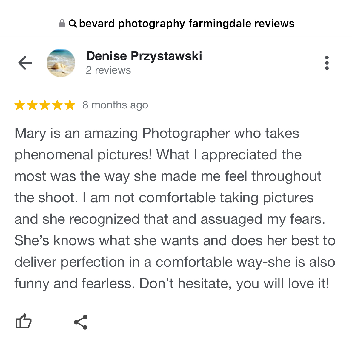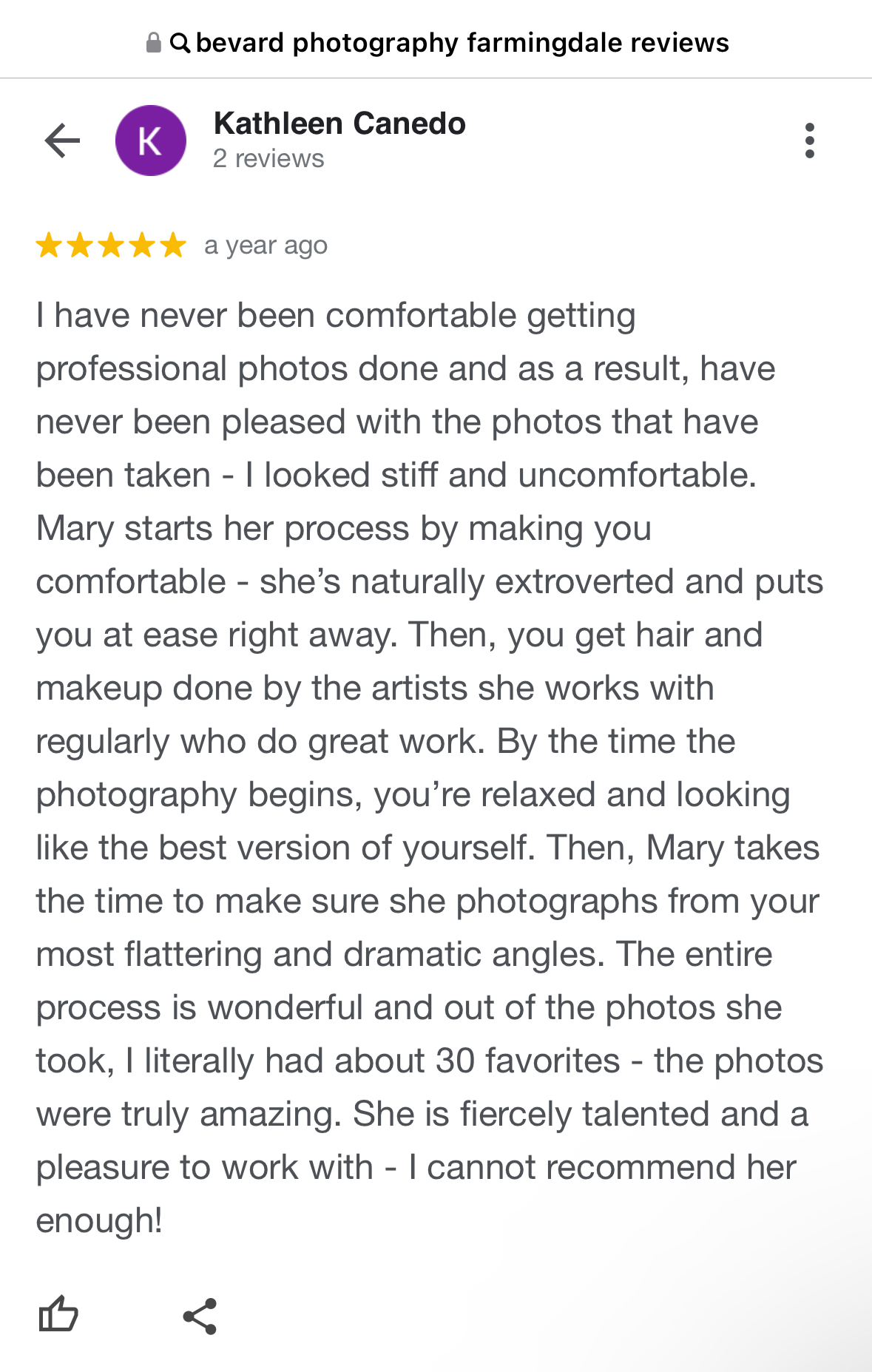 Do this ! Don’t feel shy! It’s an amazing experience to focus on yourself and capture your spirit on camera . Mary is a sweetheart and super talented. I felt completely comfortable and inspired. She has great ideas and she gets to know you beforehand…during your consult , the style and personality of your professional shoot is designed around you . This isn’t glamour shots...this is whole other level. Let your inner beauty shine through! With the help of some fantastic artistry and great makeup and lighting. I would highly recommend Mary BeVard Studios . You’re worth it!